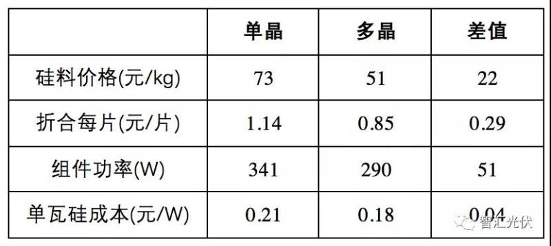 硅成本則主要由多晶硅料的價格來決定的。如果按照156.75mm硅片考慮,目前1kg單、多晶硅片的出片量約為64片和60片,封裝成320W和290W組件,則折合的硅成本如下。