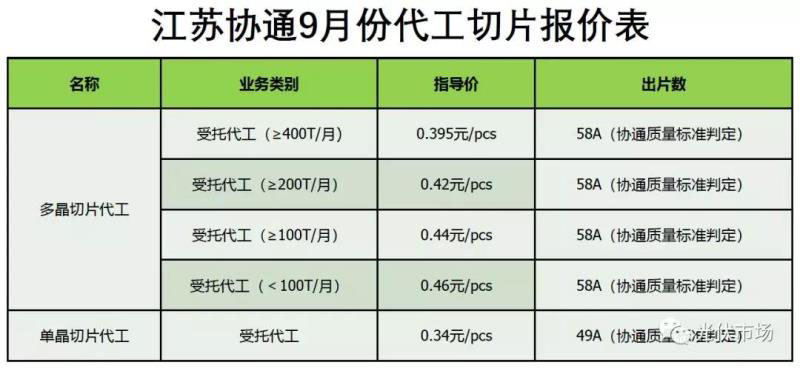 下表為江蘇協(xié)通對外切片代工的報價,多晶0.395元/片,單晶0.34元/片。