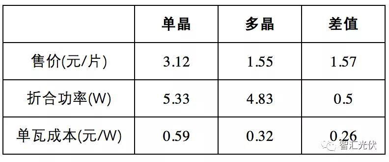 硅片的價格主要由龍頭定價,目前單晶低阻硅片、多晶硅片價格大約為3.07元/片和1.55元/片。按照目前的情況,單晶、多晶硅片加工成320W和290W組件(60片、156.75mm),則折合到組件端的硅片價格如下表。