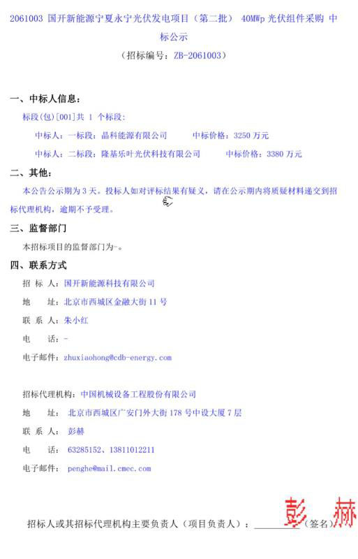 2月24日,國(guó)開(kāi)新能源寧夏永寧光伏發(fā)電項(xiàng)目(第二批) 40MWp光伏組件采購(gòu)中標(biāo)結(jié)果公示。一標(biāo)段中標(biāo)人為晶科能源有限公司(以下簡(jiǎn)稱“晶科能源”),二標(biāo)段中標(biāo)人為隆基樂(lè)葉光伏科技有限公司(以下簡(jiǎn)稱“隆基樂(lè)葉”)。