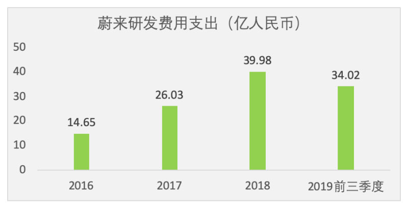 2018年,蔚來整體研發(fā)投入為39.979億元人民幣,比2017年增長53.6%。2019年前三季度研發(fā)費(fèi)用支出34.02億元,在艱難的第三季度,蔚來在研發(fā)方面的投入依然達(dá)到了10.232億元。