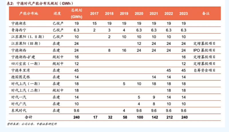 截至2019年底,寧德時代已投產(chǎn)產(chǎn)能58GWh,兩份公告涉及的鋰電池建設(shè)項目將為公司補(bǔ)充新增產(chǎn)能合計97GWh。
