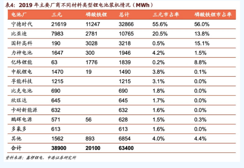 2019年寧德時代裝機(jī)量32GWh,占國內(nèi)總裝機(jī)52%,其中三元21GWh,磷酸鐵鋰11GWh,均處于國內(nèi)第一位。寧德時代在三元、磷酸鐵鋰兩種材料體系上的絕對領(lǐng)先,凸顯公司作為國內(nèi)電池龍頭絕對技術(shù)領(lǐng)先和廣闊的市場能力。