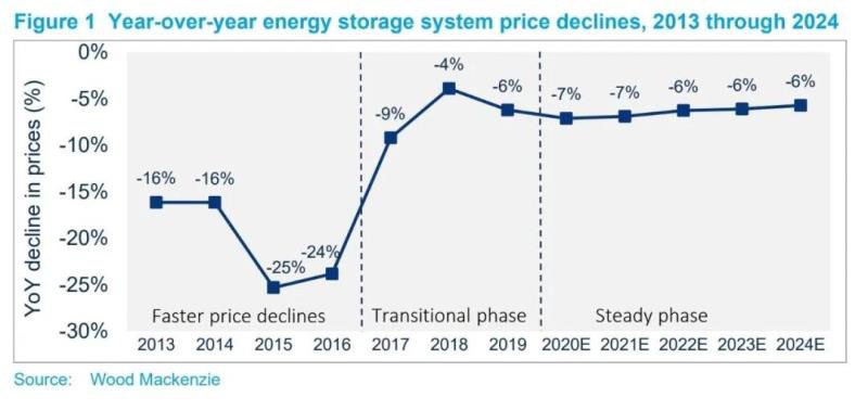 盡管在過(guò)去10年的中期,儲(chǔ)能系統(tǒng)的成本經(jīng)常以兩位數(shù)的百分比下降,但近年來(lái)下降趨勢(shì)有所放緩。WoodMac表示,去年系統(tǒng)價(jià)格下跌了約6%,這或多或少也是該行業(yè)在可預(yù)見(jiàn)的未來(lái)可以預(yù)期的發(fā)展趨勢(shì)。
