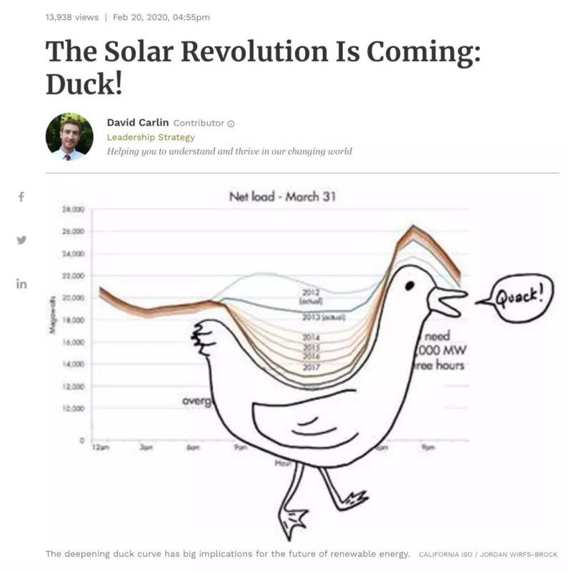 福布斯網(wǎng)站發(fā)表署名David Carlin的文章,題目是:The Solar Revolution Is Coming: Duck! 前一句的意思是“太陽能革命正在到來”,這里Duck是雙關(guān)語:一方面是指太陽能光伏帶來的負(fù)荷“鴨子”曲線,另一方面是指如何因勢(shì)利導(dǎo)應(yīng)對(duì)這個(gè)鴨子曲線。