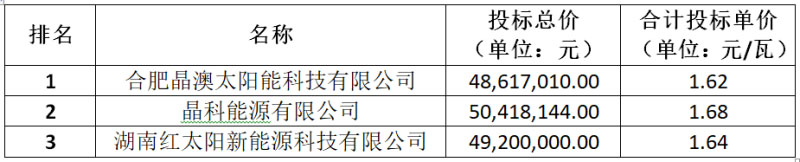 2月26日,中核山東能源貴州省盤州經(jīng)濟(jì)開發(fā)區(qū)30MWp分布式發(fā)電項(xiàng)目組件設(shè)備國(guó)內(nèi)公開招標(biāo)中標(biāo)候選人公示。合肥晶澳太陽(yáng)能科技有限公司以48617010元的投標(biāo)總價(jià),單價(jià)1.62元/瓦位列第一中標(biāo)候選人。