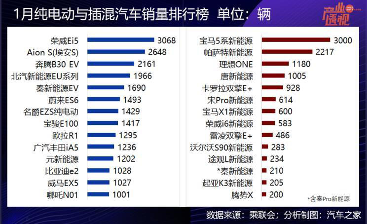 值得注意的是造車新勢力,蔚來汽車、理想汽車、威馬汽車、合眾新能源四家新勢力1月份的批發(fā)銷量均超過了1000輛。蔚來汽車以蔚來ES6為主,銷售1493輛,蔚來ES8批發(fā)銷售105輛。理想汽車交付1180輛理想ONE,威馬EX5銷售1027輛,合眾新能源的哪吒N01銷售1001輛。另外,華晨寶馬、上汽大眾、廣汽豐田三家合資車企進榜,廣汽豐田的iA5銷售1236輛,雷凌雙擎E+銷售486輛。合資車企在2020年的動作會加快,苗頭已現(xiàn)。