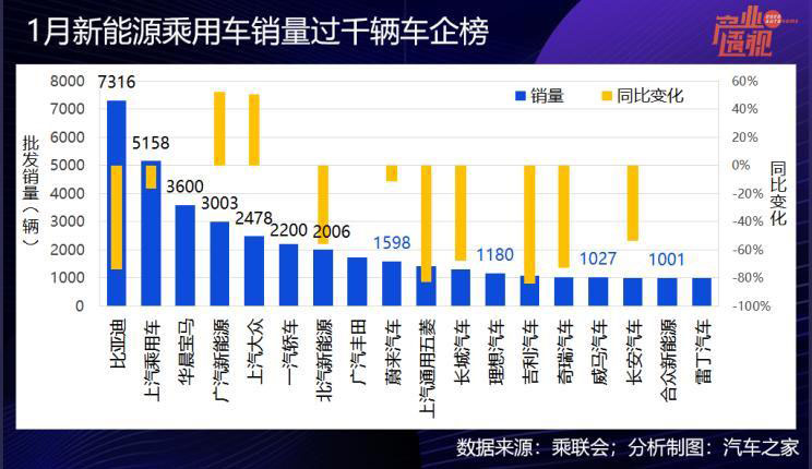 1月僅40家車企有新能源汽車批發(fā),銷量超過1000輛的車企只有18家,且無一過萬,超過5000輛的只有區(qū)區(qū)兩家。最高的是比亞迪,但是7316輛的銷量同比大跌了74%,“老牌”新能源車企可以說是哀鴻一片——北汽新能源批發(fā)銷售2006輛,同比大跌56%,上汽通用五菱跌去83%,吉利汽車跌84%,奇瑞汽車跌73%,長安汽車跌53%。上汽乘用車月銷量排第二,同比跌去16%,算是表現(xiàn)很好的了。
