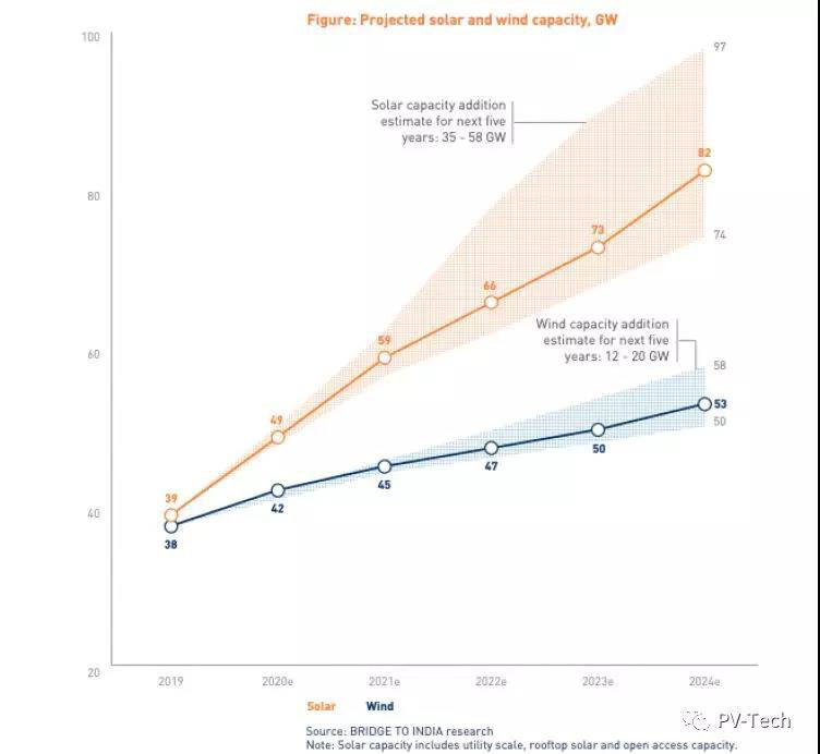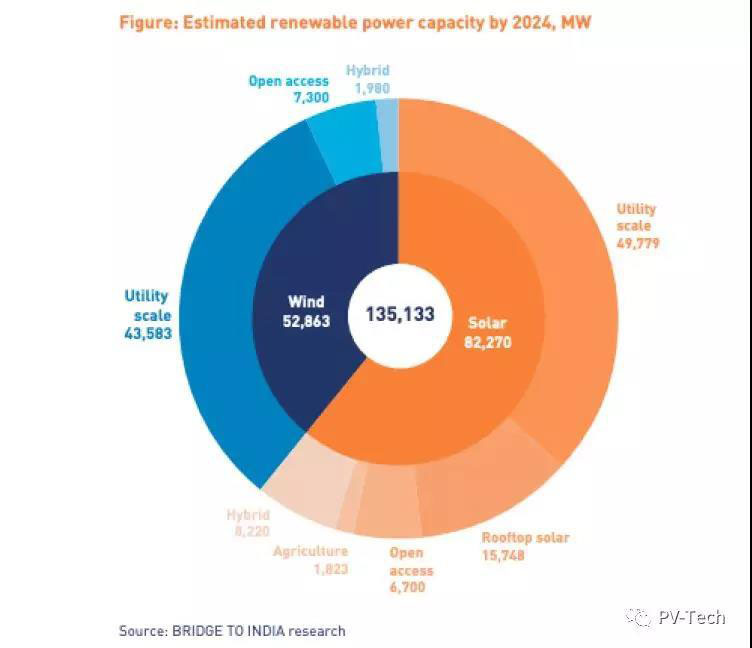 咨詢公司印度之橋的最新報(bào)告顯示,如果印度的政策環(huán)境能夠在很大程度上維持現(xiàn)狀,那么至2024年年底,印度的太陽能和風(fēng)電項(xiàng)目裝機(jī)量預(yù)計(jì)會(huì)分別達(dá)到82GW和53GW。