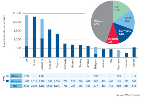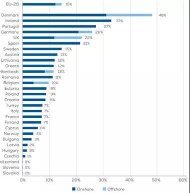 2019年歐洲各國海上風電和陸上風電新增裝機數(shù)據(jù)