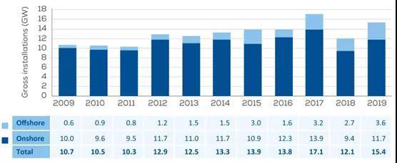 2019年,歐洲風電新增裝機容量15.4GW,比2018年增長27%,但比裝機最高年份的2017年下降了10%。