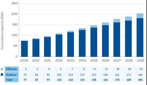 截止2019年底,歐洲風電累計裝機容量205GW。風力發(fā)電電量占到了歐盟28個成員國當年電力消耗的15%。