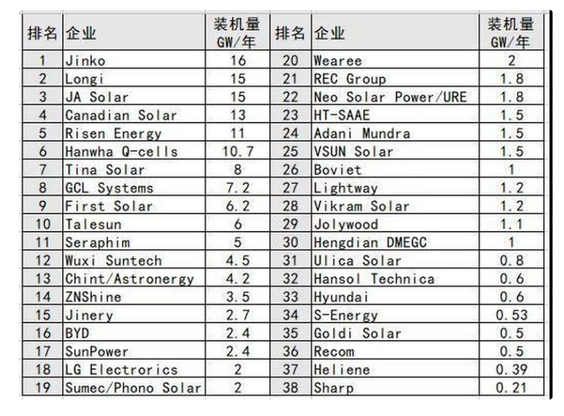 3、獲得BNEF Tier 1評(píng)價(jià)的光伏組件企業(yè)共38家,合計(jì)年產(chǎn)能為156.63GW,約占全球光伏組件產(chǎn)能的70%;排名前六名的組件制造商年產(chǎn)能都在10GW以上。
