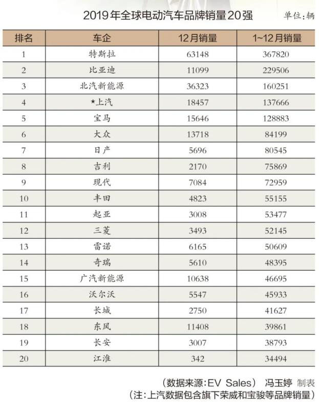值得一提的是,中國自主品牌占據(jù)了榜單20強(qiáng)的半壁江山。北汽新能源在更換Logo后,去年12月單月銷量再創(chuàng)新高,達(dá)到3.6萬輛,助其牢牢鎖定了銷量排行榜季軍的位置。受去年新能源汽車補貼退坡影響,雖然中國新能源汽車市場總體出現(xiàn)下滑,但大部分中國品牌車企在排行榜上表現(xiàn)不錯。其中,吉利以7.59萬輛的成績,從此前排行榜的第14位上升至第8位。廣汽新能源、長城汽車和長安汽車更是首次闖入榜單。其中,廣汽新能源“來勢洶洶”。EV Sales的數(shù)據(jù)顯示,去年12月,廣汽新能源銷量達(dá)到1.06萬輛,全年銷量為4.67萬輛。Aion S成為廣汽新能源銷量的主要貢獻(xiàn)者,一上市就實現(xiàn)“七連漲”,也為其2020年持續(xù)熱銷奠定了基礎(chǔ)。此外,去年12月,東風(fēng)旗下新能源汽車銷量高達(dá)11408輛,創(chuàng)單月銷量紀(jì)錄,并成功超越比亞迪。當(dāng)然,也有一些自主品牌表現(xiàn)不佳,例如去年奇瑞新能源汽車銷量下滑26%,排名從此前的第7位下滑至第14位;江淮銷量下滑30%,排名從第13位下滑至第20位,江淮去年12月銷量僅為342輛,前景不容樂觀。