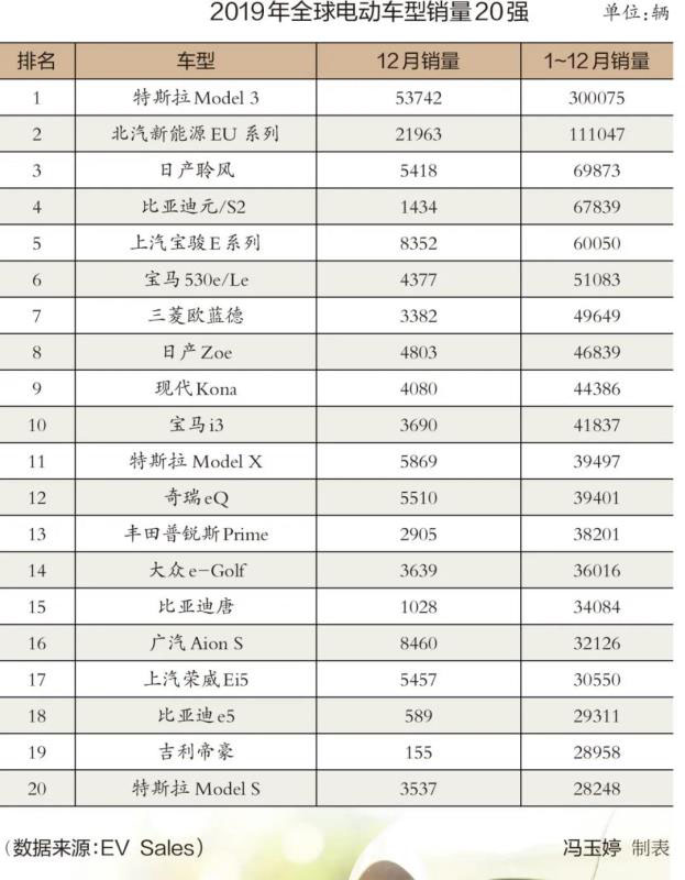 沒有任何意外,特斯拉Model 3蟬聯(lián)2019年全球電動車型的銷量冠軍,第二次榮膺年度銷量王的稱號。2019年,全球共有兩款電動車型銷量突破10萬輛,分別是特斯拉Model 3和北汽新能源EU系列,前者的銷量幾乎是后者的3倍。去年12月,特斯拉Model 3單月銷量創(chuàng)下歷史新高,達(dá)到5.37萬輛;北汽新能源EU系列也刷新了自身的銷量紀(jì)錄,單月銷量突破2萬輛。