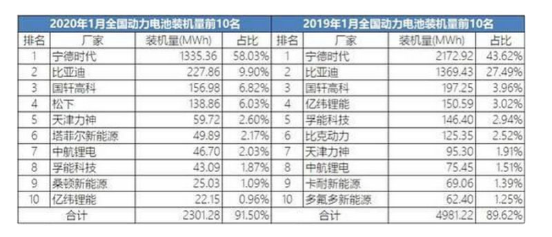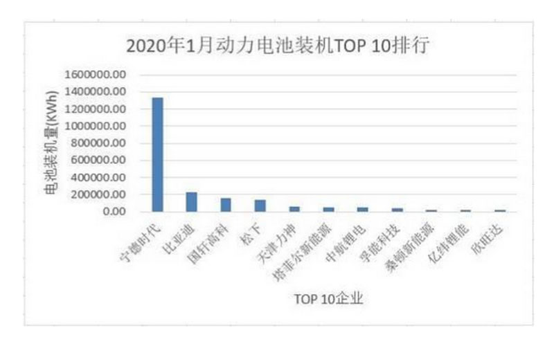 2020年1月全國新能源汽車動力電池裝機(jī)量中,排名第一的仍然是寧德時代,裝機(jī)量為1335.36MWh,比亞迪緊隨其后,以227.86MWh的裝機(jī)量位列第二,國軒高科在乘用車和商用車市場的同時發(fā)力之下,以156.98MWh的成績位居第三,而松下依靠特斯拉Model 3的國產(chǎn)以138.86MWh的成績獲得了第四名。