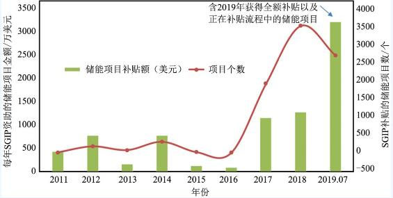 圖12011—2019年7月期間SGIP補貼的儲能項目數(shù)量和金額