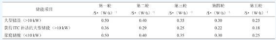 按照規(guī)定,儲能補貼的總資金分為五輪發(fā)放,第一輪補貼的標準為50美分/(W·h),第二輪補貼標準降低10美分/(W·h),之后的補貼標準逐步降低5美分/(W·h)。儲能系統(tǒng)可獲得的補貼等于系統(tǒng)容量(W·h)與所在輪數(shù)的補貼標準的乘積。例如某套儲能系統(tǒng)沒趕上第一輪申請,但成功的進入了第二輪申請,那么其補貼標準按照40美分/(W·h)執(zhí)行。補貼除了跟資金處于發(fā)放的輪數(shù)有關,還隨著系統(tǒng)時長的增加而階梯式降低,也隨著系統(tǒng)容量的增加而階梯式降低。如表2、表3所示。