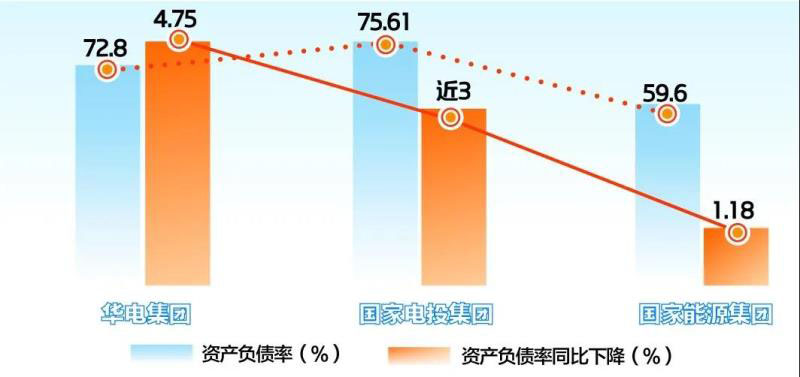 截止到2019年末,國家能源集團資產(chǎn)負債率59.6%,同比降低1.18個百分點,首次低于60%。華電集團資產(chǎn)負債率降至72.8%,同比下降4.75個百分點。國家電投集團資產(chǎn)負債率較年初下降近3個百分點,為75.61%,財務狀況持續(xù)改善。(華能集團、大唐集團數(shù)據(jù)略)