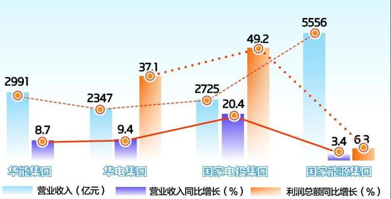 2019年,煤炭市場供需有所緩和、減費降稅力度加大、清潔能源進一步緩解、資金市場趨于寬松,發(fā)電企業(yè)營業(yè)收入保持增長態(tài)勢。國家能源集團全年營業(yè)收入5556億元,同比增長3.4%;利潤總額同比增長6.3%。華能集團營業(yè)收入同比增長8.7%,為2991億元。國家電投集團全年實現(xiàn)營業(yè)收入2725億元,同比增長20.4%;利潤總額同比增長49.2%。華電集團全年實現(xiàn)銷售收入2347億元,同比增長9.4%;利潤總額同比增長37.1%。(大唐集團數(shù)據(jù)略)
