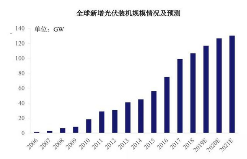 根據(jù)彭博新能源財(cái)經(jīng)(BNEF)統(tǒng)計(jì),全球光伏發(fā)電新增裝機(jī)容量從2008年的5.95GW迅速增長到2018年的106GW,復(fù)合增長率達(dá)31.32%。而2018年全球所有可再生能源新增裝機(jī)量為171GW,光伏新增裝機(jī)量占可再生能源裝機(jī)量的一半以上,累計(jì)光伏裝機(jī)容量占全球可再生能源的三分之一左右,全球光伏行業(yè)在過去十年呈現(xiàn)出高速增長態(tài)勢。