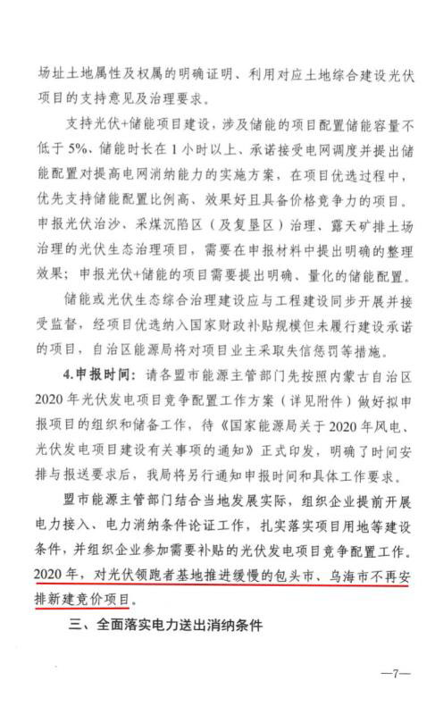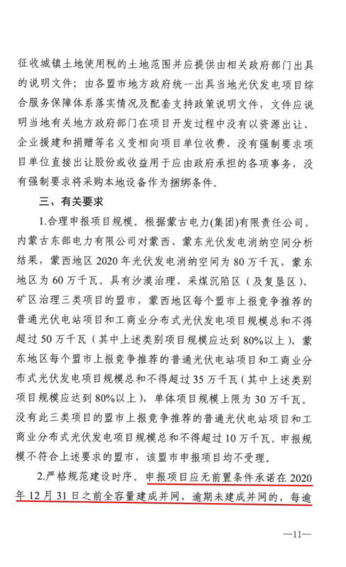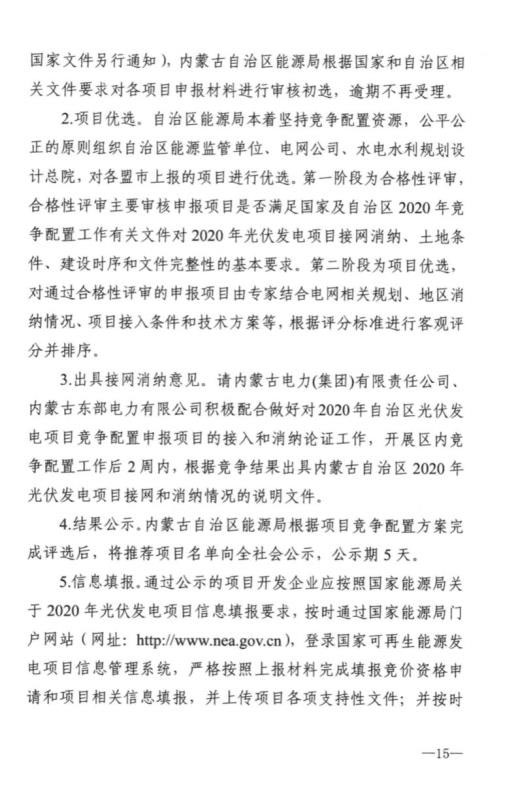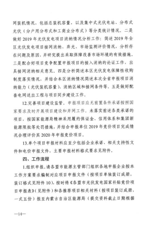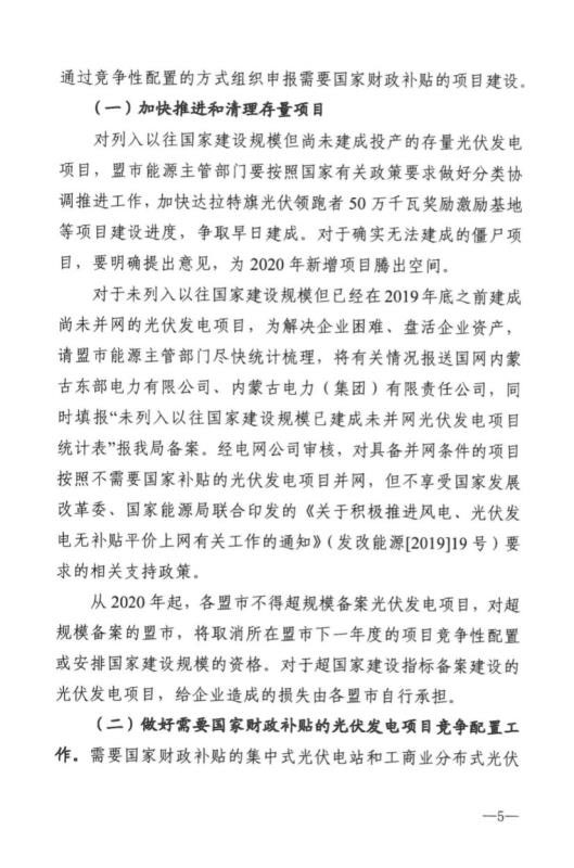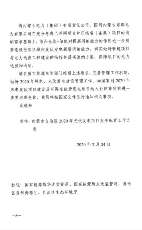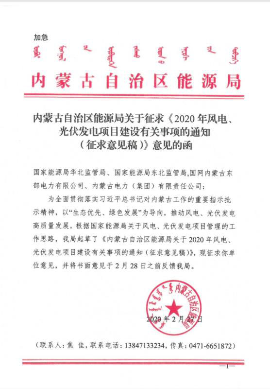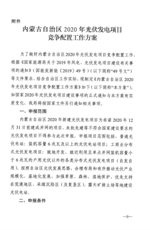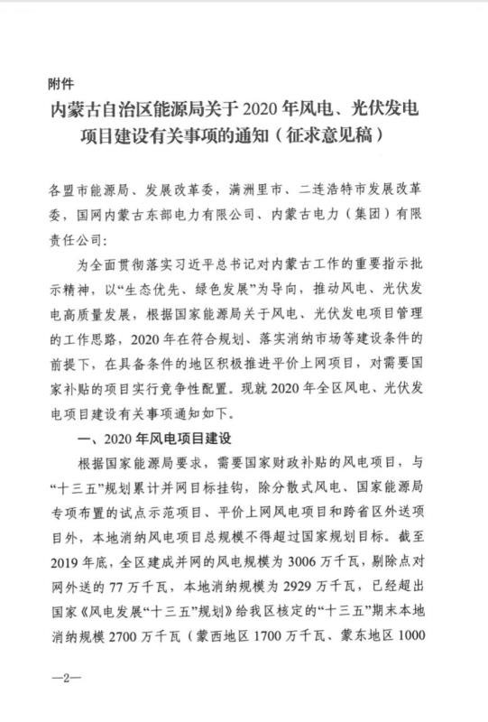 近日,內(nèi)蒙古自治區(qū)能源區(qū)印發(fā)關于征求《2020年風電、光伏發(fā)電項目建設有關事項的通知(征求意見稿)》意見的函。2020年內(nèi)蒙古自治區(qū)新增的光伏發(fā)電消納空間全部通過競爭性配置的方式組織申報需要國家財政補貼的項目建設。