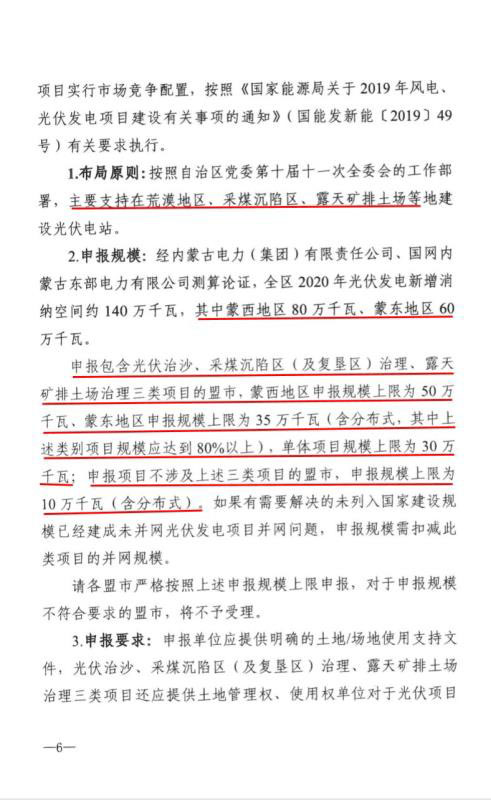 根據(jù)文件,2020年新增光伏發(fā)電消納空間全部通過競爭性配置組織申報,主要支持荒漠、采煤沉陷區(qū)(復墾區(qū))、露天礦排土場。2020年光伏新增消納空間共1.4GW,其中蒙西800MW、蒙東600MW。