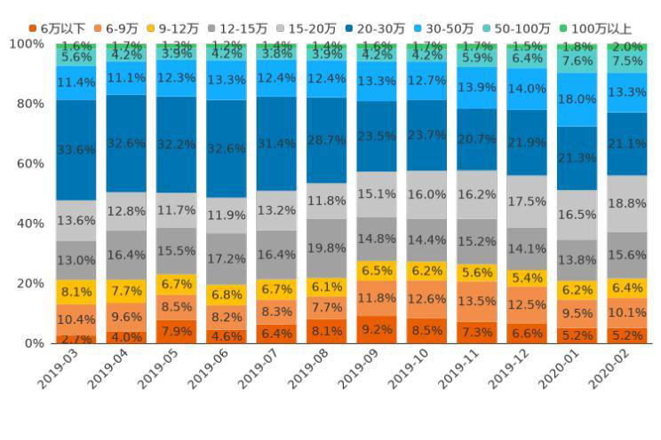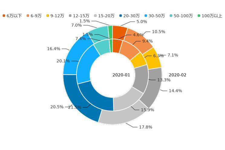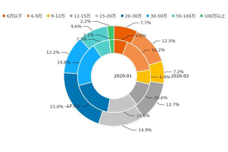 通過分析近12個月的用戶意向數據發(fā)現,2019年3月至今年2月,12萬以下價區(qū)用戶意向占比增加0.5個百分點,低價市場熱度有所升溫;12-20萬價區(qū)用戶意向占比上漲7.8%,市場熱度保持大幅增長;20萬以上價區(qū)用戶意向占比,下跌8.3個百分點,其中,20-30萬價區(qū)市場熱度下滑明顯,近12個月線索占比下跌12.5%。未來,隨著新能源車型的布局更全面,市場將進一步細分,價區(qū)覆蓋也會更加均勻。