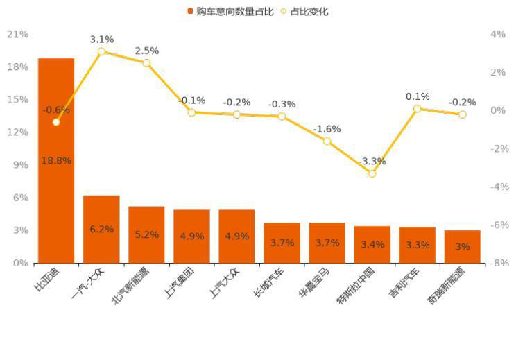 在日趨激烈的市場競爭中,各車企對于用戶的爭奪也是愈演愈烈??v觀2月市場,TOP 10廠商用戶購車意向占比累計達57.1%,相較上月份額下滑0.6個百分點,市場集中度有所下降。十個廠商中,有3個廠商用戶意向占比實現上漲,份額增幅最大的廠商為一汽-大眾,以3.1%的增幅領漲TOP 10廠商;跌幅最大的廠商為特斯拉中國,下降比例為3.3%。一汽-大眾回歸第二的位置,特斯拉則從第二降至第八。