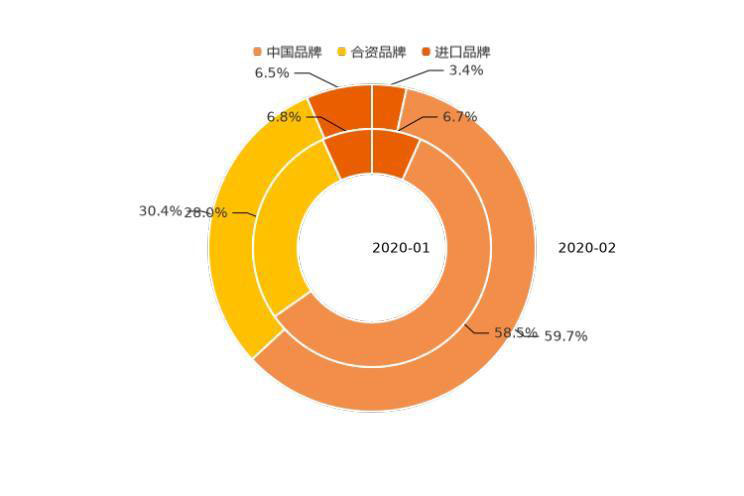 2月,中國品牌用戶購車意向占比相較上月,增加1.1個百分點,達到59.7%,用戶熱度有所升溫。合資品牌用戶意向占比為30.4%,相對上月意向份額上升2.4%。進口品牌份額從6.8%下降至6.5%。在華獨資車企(目前僅特斯拉)用戶購車意向從6.7%降至3.4%。