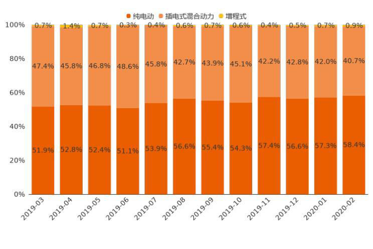 今年2月,新能源車中純電動車型用戶購車意向占比為58.4%,相較上月小幅上漲1.1個百分點,購車意向占比持續(xù)提升;插電式混合動力車型購車意向占比為40.7%,與上月相比小幅下跌1.3個百分點,購車意向占比持續(xù)下滑;增程式車型用戶意向占比僅為0.9%。整體來看,較長時間里,純電動車用戶意向長期高于50%的位置,且最近幾月呈上升態(tài)勢。這一定程度上反映了,經過一段時間的引導,用戶對純電動車的認知度和接受度在提高。