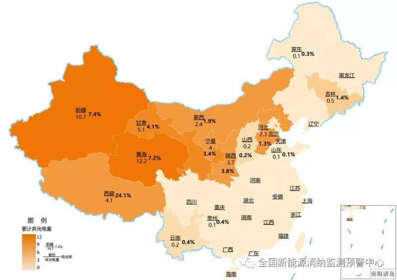 棄光情況:西藏24.1%、新疆7.4%、青海7.2%,其他省份均低于5%;