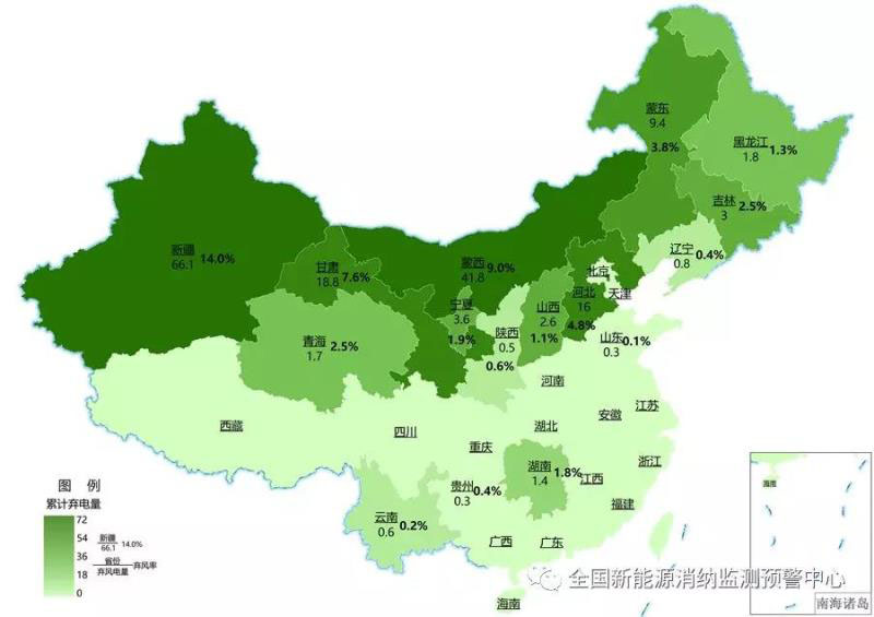 棄風(fēng)情況:新疆14%、蒙西9%、甘肅7.6%,其他省份均低于5%;