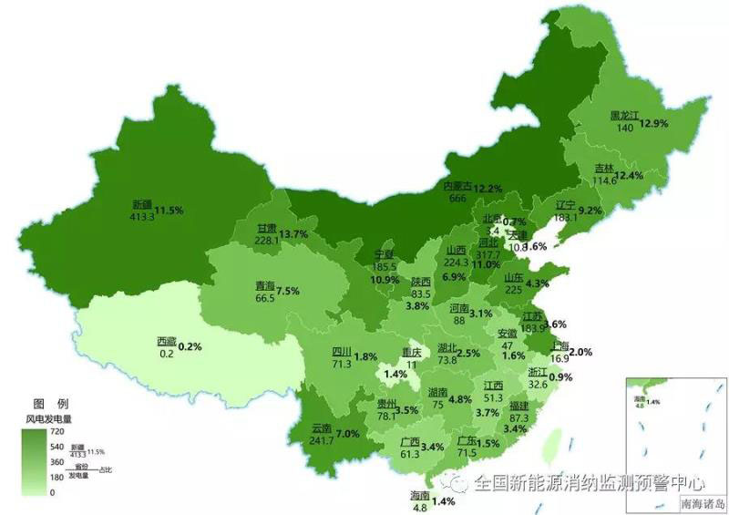 甘肅、黑龍江、內(nèi)蒙、吉林、新疆、河北、寧夏的風(fēng)電發(fā)電量占比超過10%;