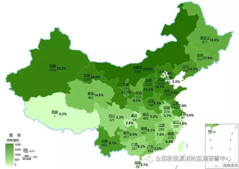 甘肅、內(nèi)蒙、寧夏、新疆的風(fēng)電裝機(jī)占比超過20%;