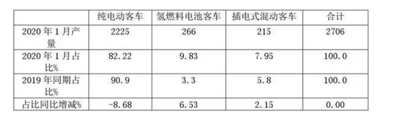可見,在2020年1月按技術(shù)路線劃分新能源客車產(chǎn)品產(chǎn)量結(jié)構(gòu):
