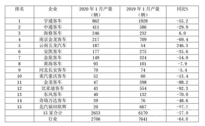 宇通客車仍然是當(dāng)之無愧的“老大哥”,但產(chǎn)量也只有862輛,不足千輛,與2019年1月的近2000量比大降55.2%;中通客車產(chǎn)量411輛,同比下降近3成,位居第二;海格與南京金龍產(chǎn)量均在200多輛層級上徘徊,海格同比微增,南京金龍同比大降近7成,兩家分別位居第三和第四,可是境況大不相同;前15名車企中,同比只有2家增長,增長最大的是云南五龍汽車,增幅達(dá)到246.3%,但這只是個案,不具有普遍性。