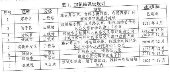 2019年12月31日,濰坊市政府印發(fā)《濰坊市氫能產(chǎn)業(yè)發(fā)展三年行動計劃(2019-2021年)》,提出2020年底前建成6座以上加氫站,2021年底前建成8座以上。