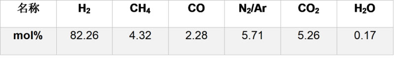 原料氣的組分如圖1-3,壓力為2.2MPa,溫度25℃,是目前化工行業(yè)中常見的原料氣條件,價(jià)格約0.9元/Nm3,年滿負(fù)荷運(yùn)行時間8400小時,產(chǎn)品氣要求滿足GB/T 37244-2018《質(zhì)子交換膜燃料電池汽車用燃料 氫氣》,產(chǎn)品氣量為1000Nm3/h(約2143kg/天)。