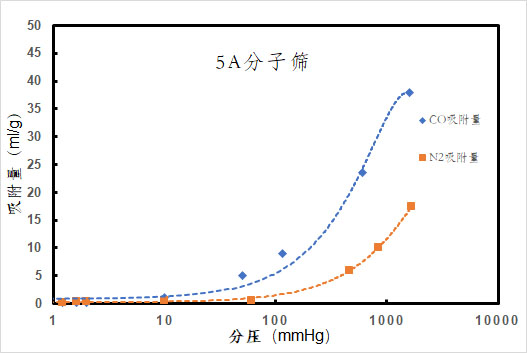 對于燃料氫氣,CO是氫氣所含雜質(zhì)中處理難度最大的。以目前工業(yè)氫氣提純上普遍采用的變壓吸附提氫(PSA)吸附劑5A分子篩為例,通過以下等溫吸附線(圖1-2)可以看出,對CO和N2的吸附量不管是在高分壓下還是在燃料氫氣除雜所關(guān)注的低分壓下,兩者的分離比約2.5,差別不大,可以理解為吸附劑對兩者的脫除能力相近,但是微量CO會導(dǎo)致燃料電池催化劑Pt的中毒失活,而如N2和Ar等惰性氣體則不會對燃料電池造成損壞,在燃料氫氣的標(biāo)準(zhǔn)中也可以看出,對兩者的含量限定相差了500倍。