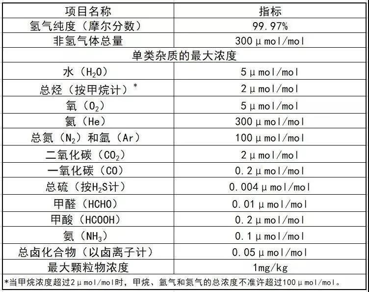 在燃料電池用氫氣的應(yīng)用上,與普通工業(yè)行業(yè)的氫氣標(biāo)準(zhǔn)GB∕T 3634.2-2011有很大不同。如下圖(圖1-1)中GB/T 37244-2018《質(zhì)子交換膜燃料電池汽車用燃料 氫氣》,在氫氣純度上,99.99%的高純氫氣可滿足燃料氫氣99.97%的要求,但難點(diǎn)在于氫氣中的微量雜質(zhì),尤其是CO≦0.2ppm是99.99%的工業(yè)純氫甚至99.999%的工業(yè)高純氫都難以達(dá)到的。工業(yè)氫氣關(guān)注氫氣純度,而燃料氫氣關(guān)注特定雜質(zhì)含量。
