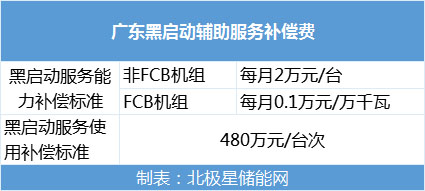 根據(jù)此前《南方區(qū)域并網(wǎng)發(fā)電廠輔助服務(wù)管理實(shí)施細(xì)則(修訂稿)》中的定義,黑啟動(dòng)服務(wù)費(fèi)分為能力費(fèi)和使用費(fèi),其中廣東地區(qū)的能力費(fèi)補(bǔ)償標(biāo)準(zhǔn)為2萬元/臺(tái)或0.1萬元/萬千瓦,使用費(fèi)補(bǔ)償標(biāo)準(zhǔn)為480萬元/臺(tái)次。