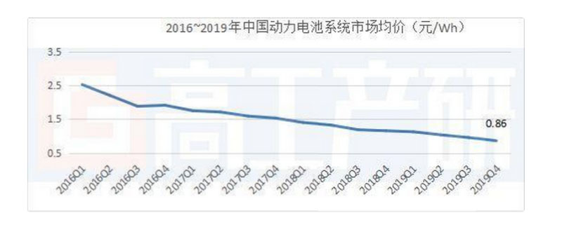 市場出現(xiàn)增量不增值的原因主要由于電池單體以及系統(tǒng)價格下降速度遠(yuǎn)大于電池單體出貨量增加速度。從季度價格走勢分布來看,2016-2019年整體價格呈現(xiàn)4%-10%不等的下降走勢,2019年電池單體價格下降走勢維持在5%-10%之間,較2018年下降幅度更大。2019年4季度動力電池系統(tǒng)不含稅價格為0.82~0.95元/Wh,較2018年4季度動力電池系統(tǒng)價格下降25.9%。GGII預(yù)測,2020年隨著電池系統(tǒng)集成化提升以及新工藝的使用,動力電池價格有望進一步下降。