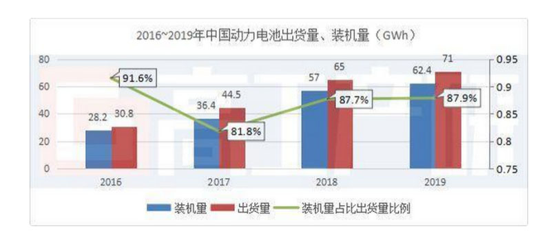 GGII調(diào)研數(shù)據(jù)顯示,2019年中國動力電池出貨量為71GWh,同比增長9.4%,相比2018年,增長速率有所放緩。減緩原因主要受新能源汽車市場產(chǎn)銷量下降影響。2019年中國新能源汽車產(chǎn)量117.7萬輛,同比下降3.4%。從動力電池出貨量及裝機量的差距來看,2017-2019年裝機量占比出貨量比例逐漸穩(wěn)定,且比例有呈減小趨勢。