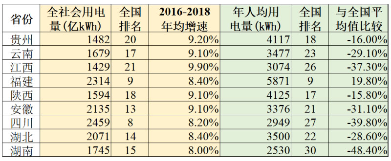 從表1可見,表中省份的全社會(huì)用電量規(guī)模與人均用電量呈現(xiàn)明顯的錯(cuò)配現(xiàn)象。在大陸地區(qū)31個(gè)省份中,GDP增長(zhǎng)較快省份全社會(huì)用電量規(guī)模普遍排名中段,而年人均用電量普遍排名靠后。除福建省外,陜西、貴州低于全國(guó)人均用電量15%左右,其余省份普遍低于全國(guó)人均用電量30%~50%左右。這一方面與GDP增長(zhǎng)較快省份的人口規(guī)模、產(chǎn)業(yè)結(jié)構(gòu)有關(guān);另一方面,這些省份多處于華中、西南地區(qū),將大量承接?xùn)|部產(chǎn)業(yè)轉(zhuǎn)移,未來(lái)人均用電量和全社會(huì)用電量都將具有較大增長(zhǎng)空間,對(duì)電能需求更加旺盛、對(duì)電網(wǎng)保障作用更加依賴。