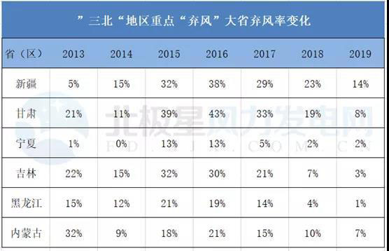 從數(shù)據(jù)來看,2019年棄風(fēng)率超過5%的地區(qū)僅有3個(gè)省份,3省棄風(fēng)電量占全國棄風(fēng)電量的 81%,新疆的棄風(fēng)率降至14.0%、甘肅的棄風(fēng)率降至7.6%、內(nèi)蒙古的棄風(fēng)率降至7.1%,遠(yuǎn)低于20%的紅色預(yù)警線。相關(guān)橙色區(qū)域內(nèi)蒙、河北等地棄風(fēng)率均下降到10%。