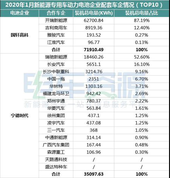 從上文的圖表中可以看出,2020年1月國(guó)軒高科配套5家車企,其中裝機(jī)量最多的是開(kāi)瑞新能源,配套車型數(shù)量為1680輛,裝機(jī)總電量為62.7MWh,占比達(dá)87.19%。