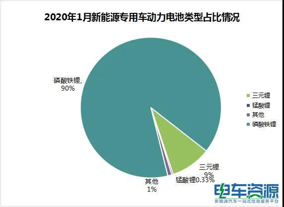 從動(dòng)力電池的技術(shù)路線來(lái)看,在2020年1月新能源專用車165.82MWh電池裝機(jī)總量中,磷酸鐵鋰占據(jù)絕對(duì)的主導(dǎo)地位,裝機(jī)量為148.29MWh,占比89.43%;三元鋰電池裝機(jī)量為15.45MWh,占比9.32%;錳酸鋰電池裝機(jī)量為0.55MWh,占比0.33%;其他未知名類型鋰電池1.53MWh,占比0.92%。