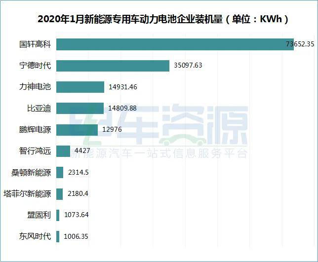 從電池廠商看,2020年1月為新能源專用車提供電池配套的企業(yè)共27家。其中,國(guó)軒高科以73.65MWh的裝機(jī)量獲得冠軍的寶座,遙遙領(lǐng)先于其他企業(yè);寧德時(shí)代以35.1MWh位居第二,電池裝機(jī)量?jī)H占國(guó)軒高科電池裝機(jī)量的一半;排名第三的是力神電池,裝機(jī)量為14.9MWh;比亞迪以14.8MWh的裝機(jī)量緊隨其后,排名第四;鵬輝電源首次擠進(jìn)前5名,裝機(jī)量為12.98MWh;縱觀近半年的電池裝機(jī)量TOP10,從3-10的排名變動(dòng)極大,呈現(xiàn)出一種異常激烈的競(jìng)爭(zhēng)局面。
