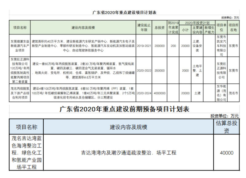 據(jù)廣東省發(fā)改委官網(wǎng)3月5日信息,《廣東省2020年重點(diǎn)建設(shè)項(xiàng)目計(jì)劃》正式發(fā)布,2020年廣東省共安排省重點(diǎn)項(xiàng)目1230個(gè)項(xiàng)目,總投資5.9萬(wàn)億元,年度計(jì)劃投資7000億元,安排開(kāi)展前期工作的省重點(diǎn)建設(shè)前期預(yù)備項(xiàng)目868個(gè),估算總投資3.4萬(wàn)億元。其中,共有4個(gè)氫能及燃料電池相關(guān)項(xiàng)目入圍。